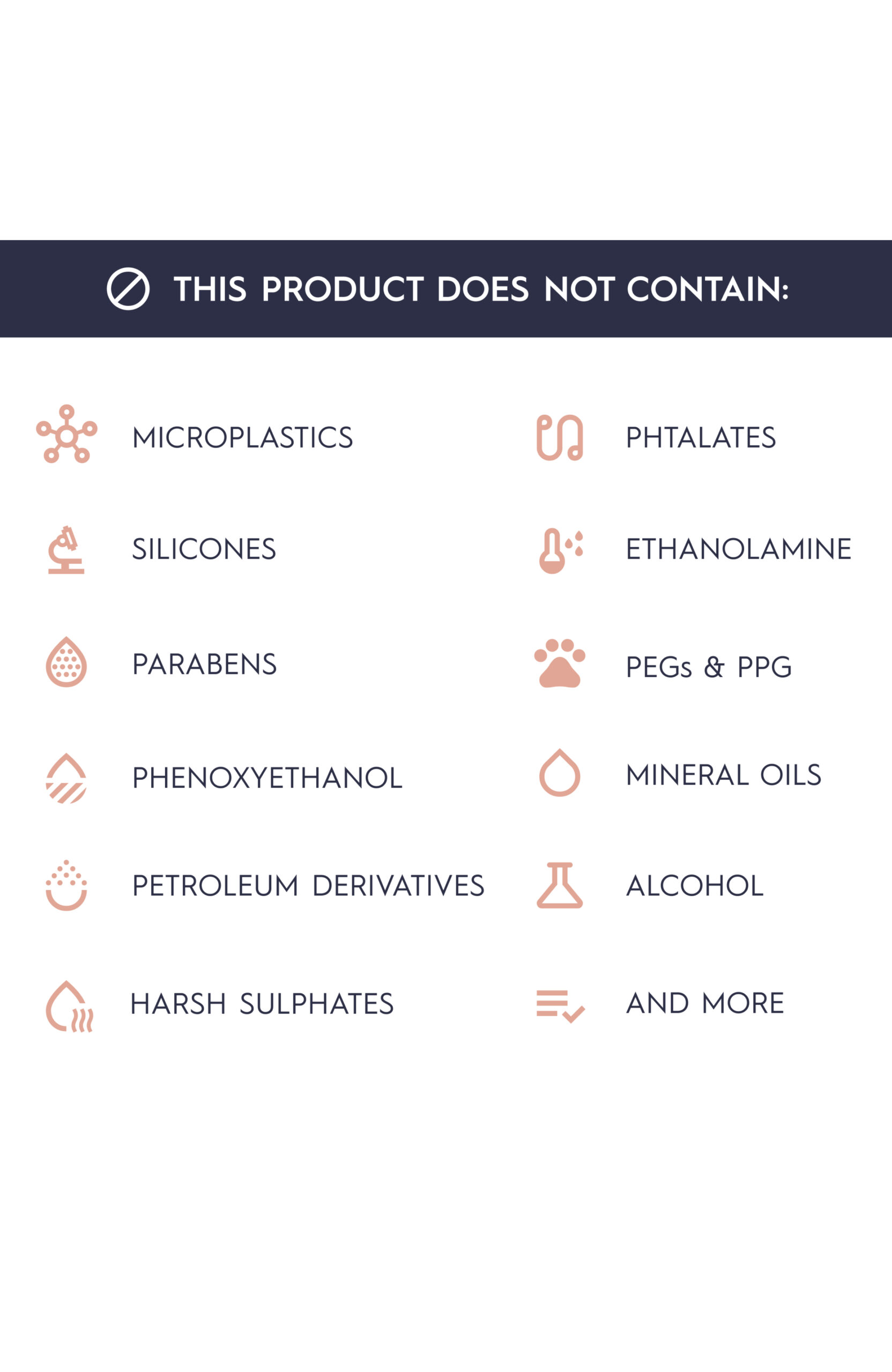 • FREE FROM parabens, phenoxyethanol, silicones, mineral oils, sulphates, phthalates, synthetic polymers, petroleum derivatives, microplastics, PEG, PPG, BHA, EDTA, DEA, acrylates, alcohol, synthetic fragrances, gluten, GMO
